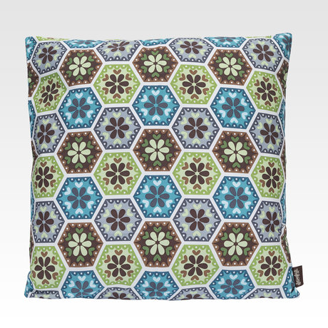 Съемный чехол декоративной подушки покрыт ярким геометрическим узором. Ритмичный орнамент из разноцветных шестигранников сочетает в себе особый стиль и идеально подойдет к любому интерьеру.